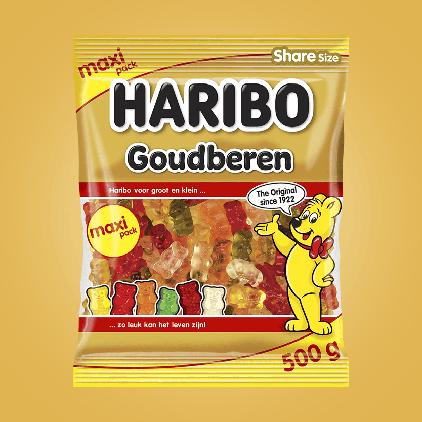 Haribo wurde 1920 von Hans Riegel gegründet. Im Jahr 1922 entwarf Hans Riegel den „Tanzbären“, den Vorgänger des „Goldbären“. Der Bär war ein großer Erfolg, und später folgte der „Goldene Bär“ mit seiner roten Schleife, die noch heute auf allen Verpackungen und Merchandising-Artikeln zu finden ist. Später kamen Gummibärchen in allen Farben hinzu, und bald wuchs Haribo von einer kleinen Fabrik in Deutschland zu einer weltweit bekannten Marke heran.