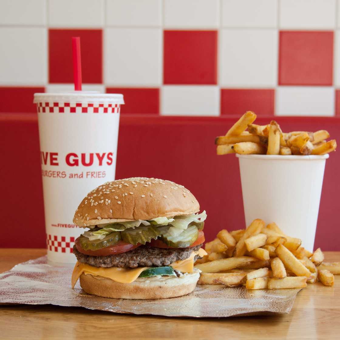 Inspired by this founding period, you can experience a very special atmosphere at Five Guys. Red and white checkered tiles decorate the walls and you can listen to rock music while eating. Let yourself be carried away by this atmosphere and be spoiled by the crew with delicious burgers and fries - we look forward to seeing you!